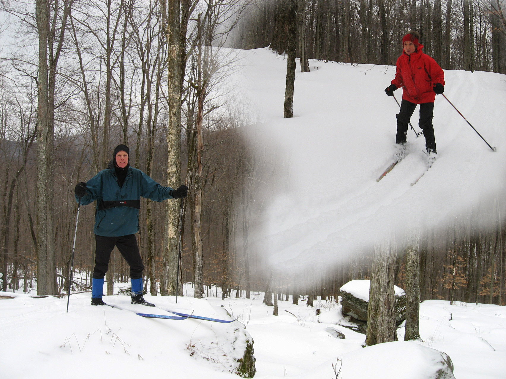 Along with removing the forest litter, the problem with backcountry skiing in the Northeast is breaking trail.  After a heavy snowfall, skiing our backdoor trail system can take two hours of hard slogging. We do it for the exercise challenge as well as the love of being outdoors in the cold winds and heavy snowfalls. We don’t do that hard slogging it for the love of skiing– because we aren’t skiing.