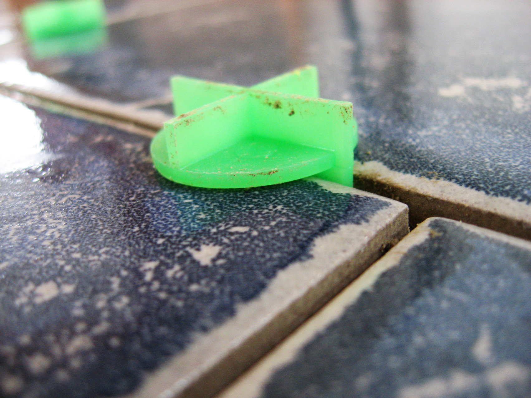 In my excitement I quickly chose #53 twilight blue grout and the sales lady said it only comes in epoxy. I was like- “Epoxy?” She said, “Yeah, people buy it all the time.” Not thinking too much about it and knowing where I wanted to put the tiles and that I didn’t want the grout to stain, I went with her casual recommendation. When I went back to pick up my special order tiles and grout, I ran into a different sales guy in the tile section and asked him something about applying the grout and he says, “Why are you using epoxy grout?” That set off bells, sirens and whistles in my brain but his main issue was the cost; I said I was using 1/16-inch grout joints. He said, “Oh, that’s OK then, it will go a long way.”