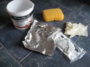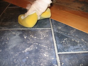 In hind sight I would say do not do this job alone on more than 40 square feet at a time. Nor would I use epoxy grout on anything but a smooth surface tile unless I had three people working the clean-up. Deb was with me last weekend and I took advantage of her presence to try my luck at the epoxy grout application. It was 70 degrees in the room which according to the chart would give me about 80 minutes of working time. My joints were 1/16 of an inch, which would cover 80 square feet. I had my 3 buckets of white vinegar and water mixed ready to go, plastic gloves, sponges on hand and cardboard down over areas I didn’t want epoxy tracked onto in the rush. The grout comes in pre-measured packets, an all or nothing mix. I said to myself, “Here goes!” and mixed the grout.